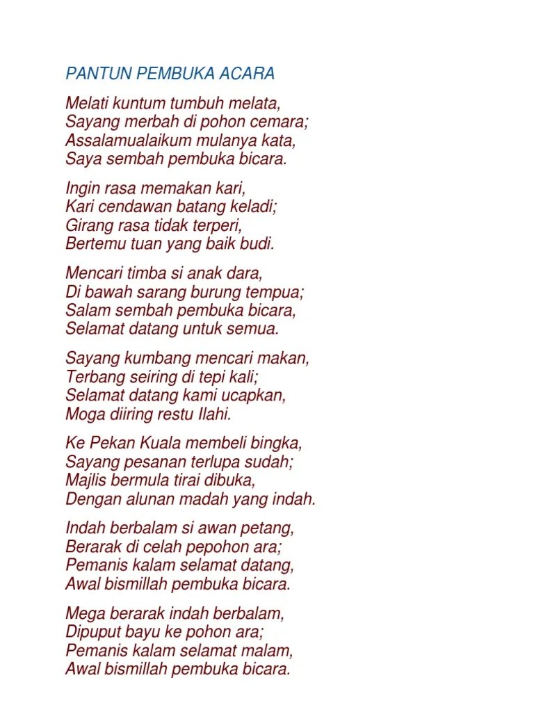 Pembuka Bicara Pantun Pembuka Kata / Pantun. Terima kasih telah datang kemari. Ingin rasa memakan kari kari cendawan batang. Pada pembukaan, kamu harus memperkenalkan diri dan menyapa audien. Pergi ke pasar menjual durian . Pantun pembuka salam untuk presentasi.
